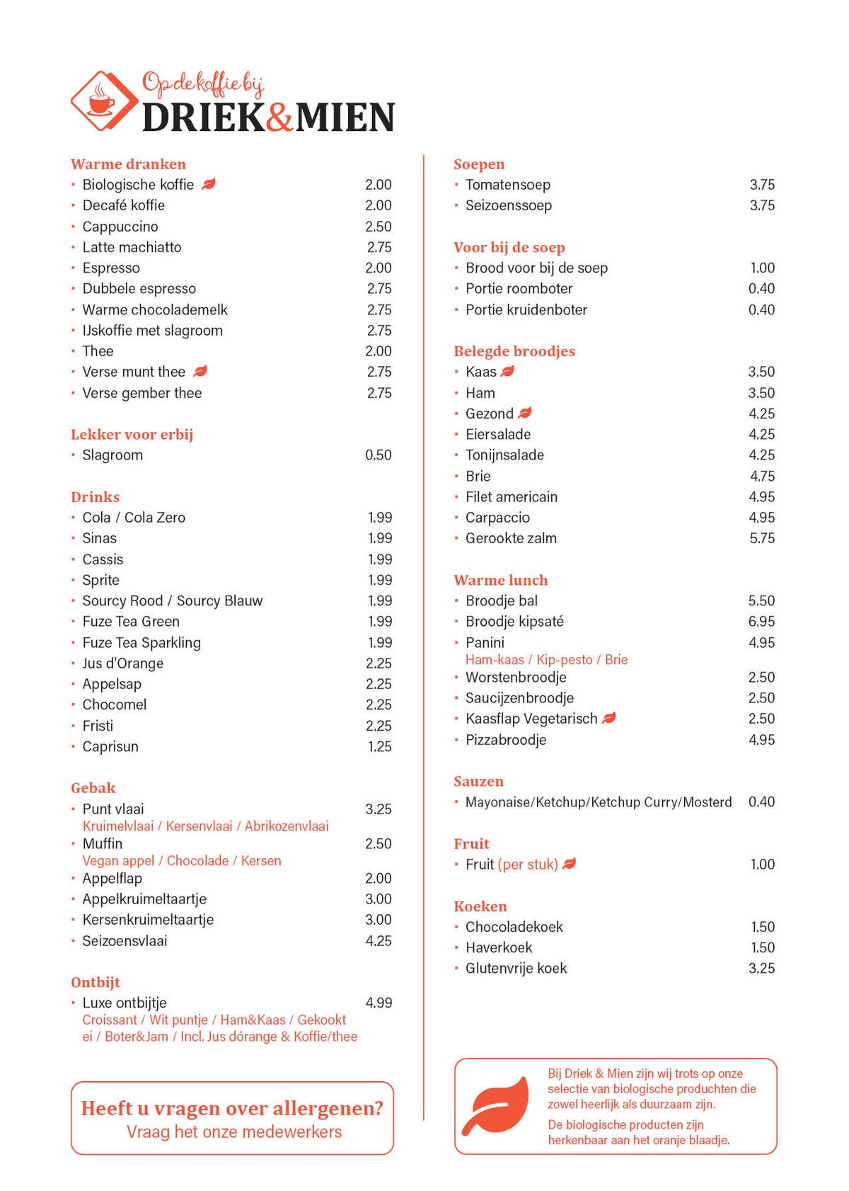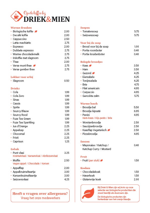 Van warme dranken tot belegde broodjes en zoete tussendoortjes: er staat van alles op de kaart. Bij Driek & Mien werken we daarnaast met biologische producten. Lekker én duurzaam. Je herkent deze aan het oranje blaadje op de kaart. Bekijk de menukaart en kies wat lekkers uit!
