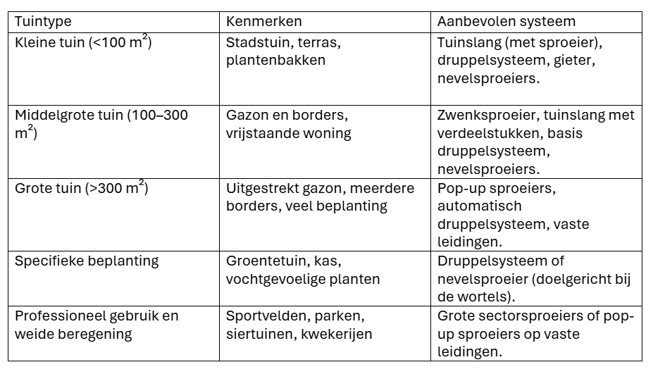 Gebruik bijvoorbeeld nevelsproeiers voor borders en moestuinen, en sectorsproeiers voor grote oppervlakken zoals het gazon.