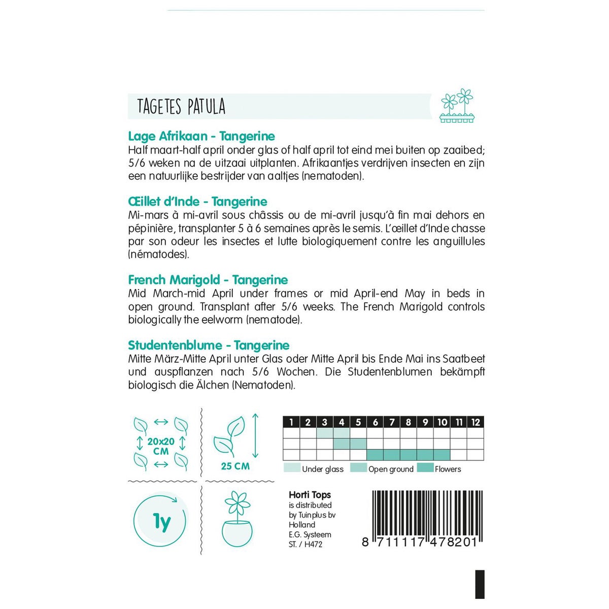 Deze variëteit kenmerkt zich door heldere oranje bloemen en een compacte groeiwijze. Perfect voor het versieren van bloembedden, randen en bloempotten. Gemakkelijk te onderhouden, resistent tegen plagen en droogte. Bloeit overvloedig gedurende het hele seizoen. Tagetes-planten (Afrikaantjes) staan erom bekend dat zij schadelijke insecten op afstand houden, terwijl ze nuttige bijen en vlinders aantrekken. Een uitstekende keuze voor een kleurrijke tuin.